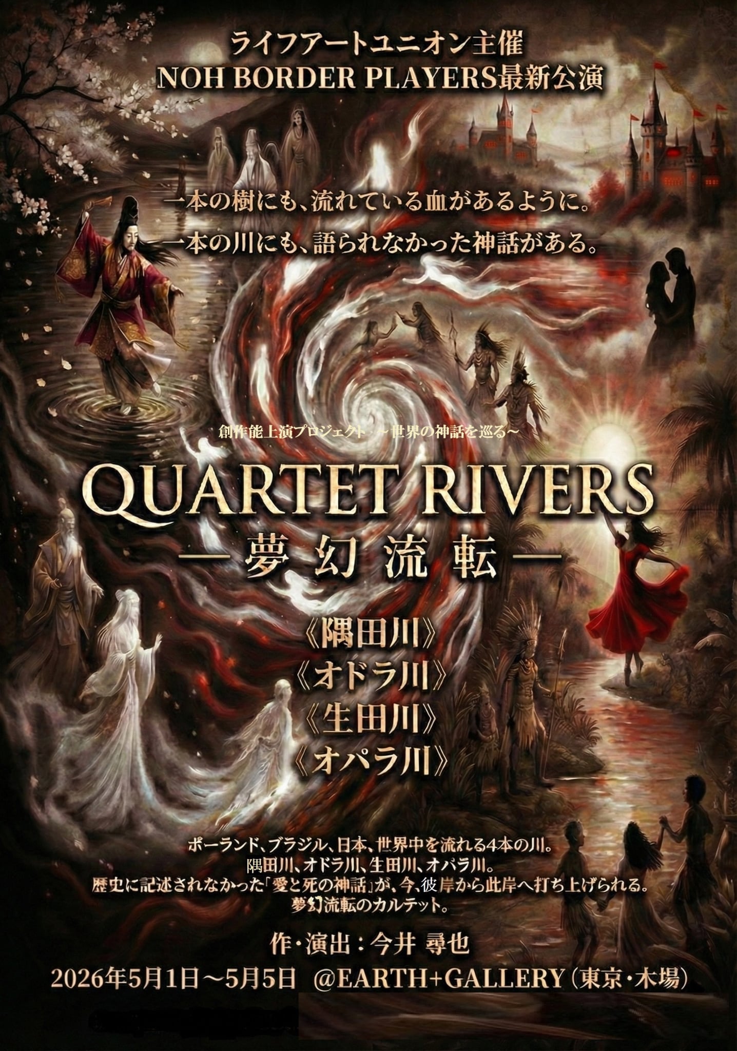 ライフアートユニオンが贈る世界神話シリーズ最新作。4本の川の物語。ポーランド、ブラジル、日本、世界中を流れる4本の川。《隅田川》《オドラ川》《生田川》《オパラ川》 歴史に記述されなかった「愛と死の神話」が今、彼岸から此岸へ打ち上げられる。 夢幻流転のカルテット。一本の樹にも流れている血があるように、 一本の川にも語られなかった神話がある。 能の身体と現代の身体が交錯する水上のボーダーレス《NOH BORDER PLAYERS》1000年の時を超え、国境を超え、「夢幻流転」する魂たちの行方を目撃せよ。